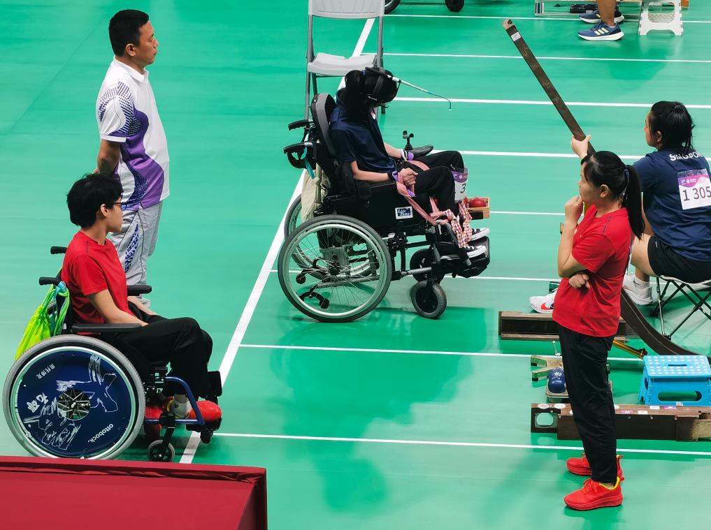 硬地滚球是最具包容性的残疾人运动之一,专门为脑瘫患者、严重躯体功能障碍的运动员而设立。这项运动的规则与冰球较为相似,双方各执六枚不同颜色的球,谁投出去的球最终距离目标白球的距离最近,就会赢得积分。对于杨贝贝来说,赛场上需要时刻保持清醒的头脑,根据场上局势部署球路,还需要精准“控制”轨道和出球点,才可以每一次投球都能有效。