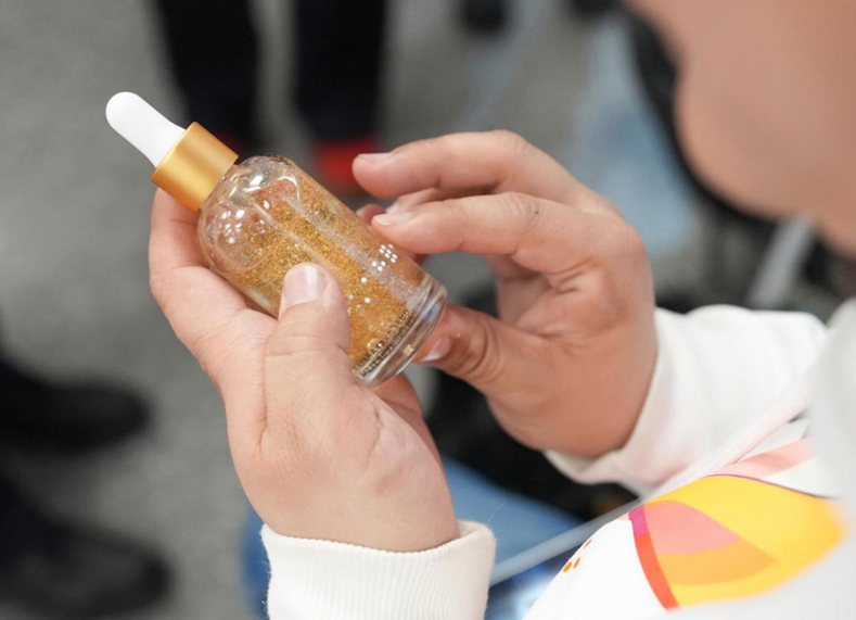 图为1月29日,在中国残联2026年迎新春中外交流活动上,一名视障嘉宾通过“阅读”盲文了解一款化妆品