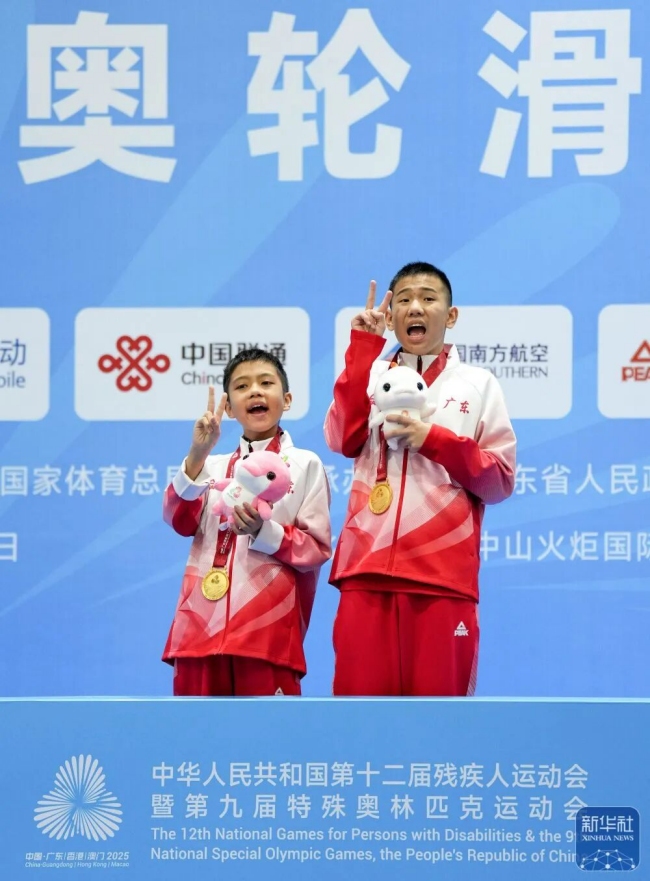 图为12月11日,广东一团队选手许腾(右)和队友张峻在颁奖仪式上合影。他们夺得全国第十二届残疾人运动会暨第九届特殊奥林匹克运动会特奥轮滑项目男子组2x100米接力M05组冠军。新华社记者 马金瑞 摄