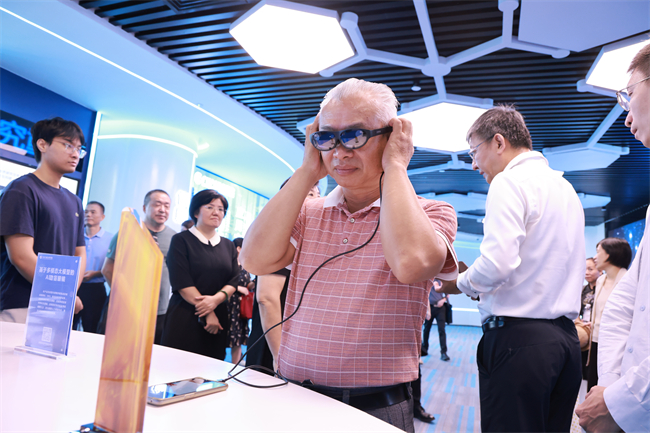 图为残联领导干部体验美替(MTE)AI助盲眼镜