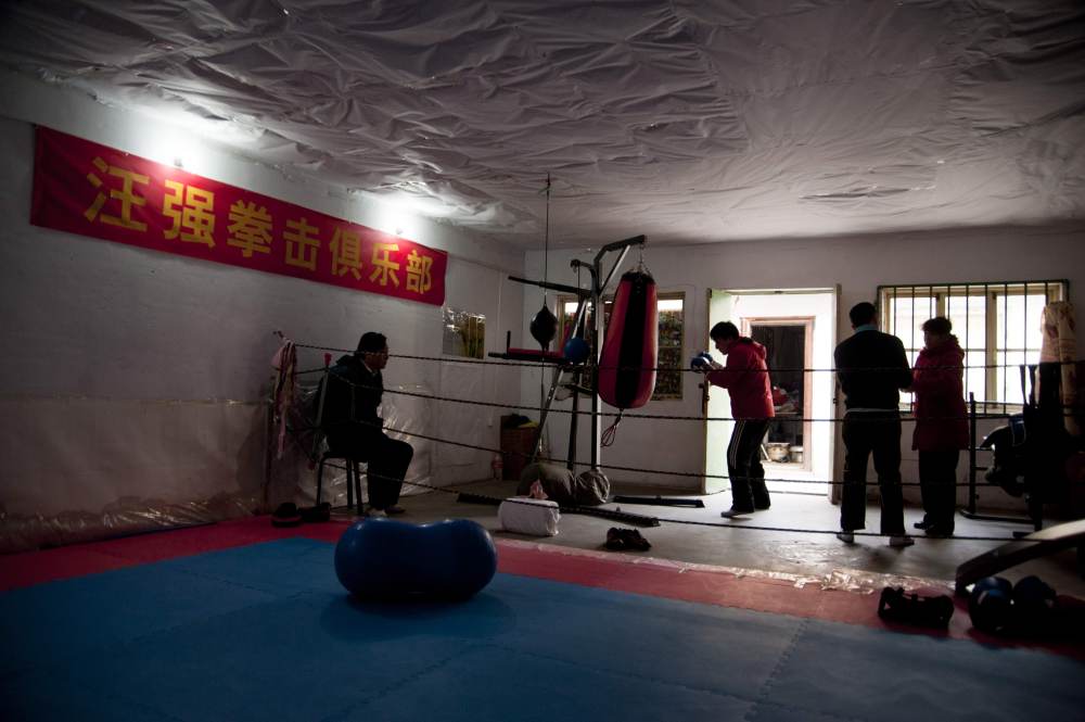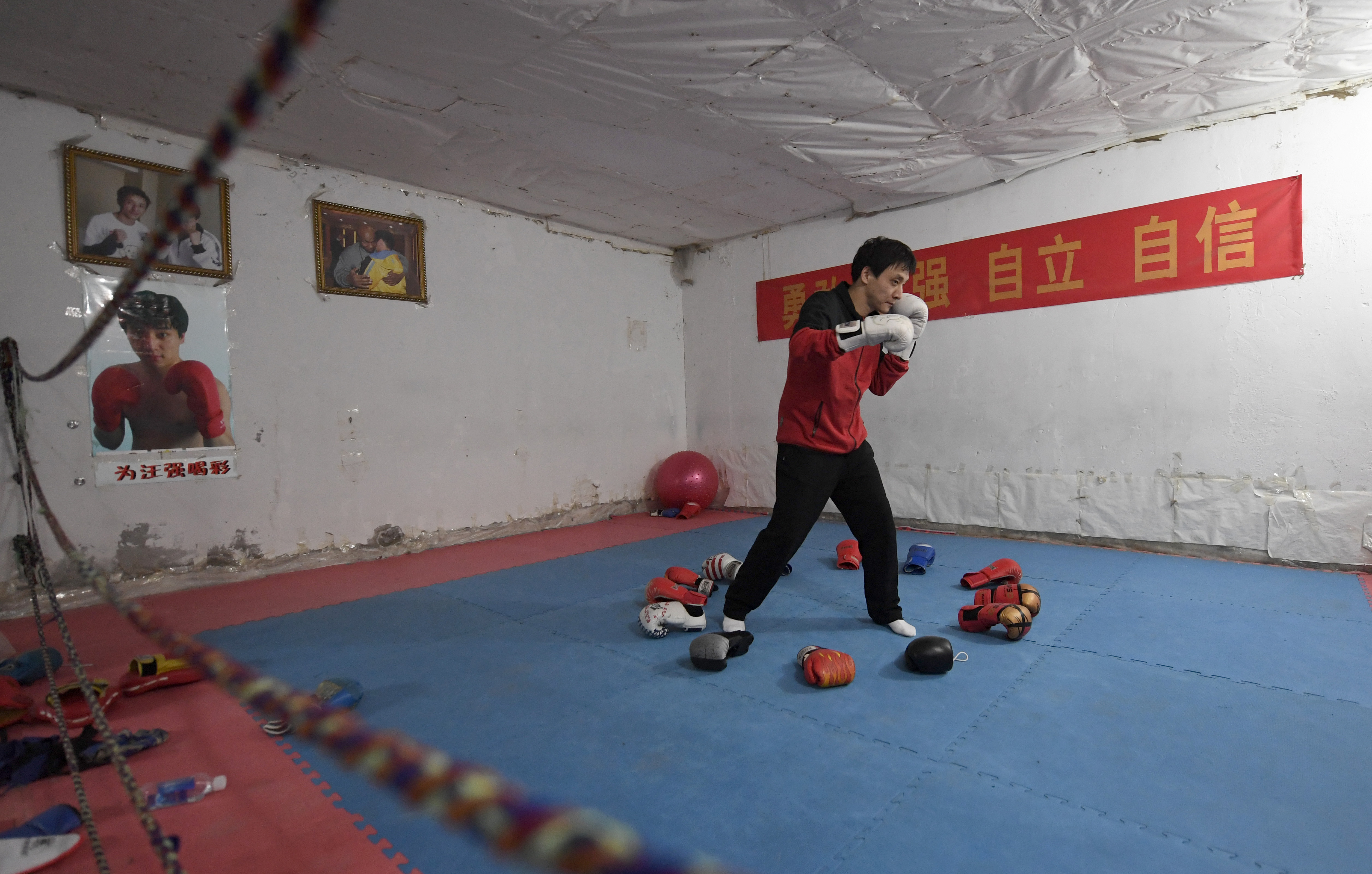 24岁那年,汪强租下小区楼下的仓库,办起了自己的拳击俱乐部,专门指导喜欢拳击的青少年。简易的房间中间铺设了一块拳击场地,十多副旧手套散落在地上,这是他自己的拳击园地。