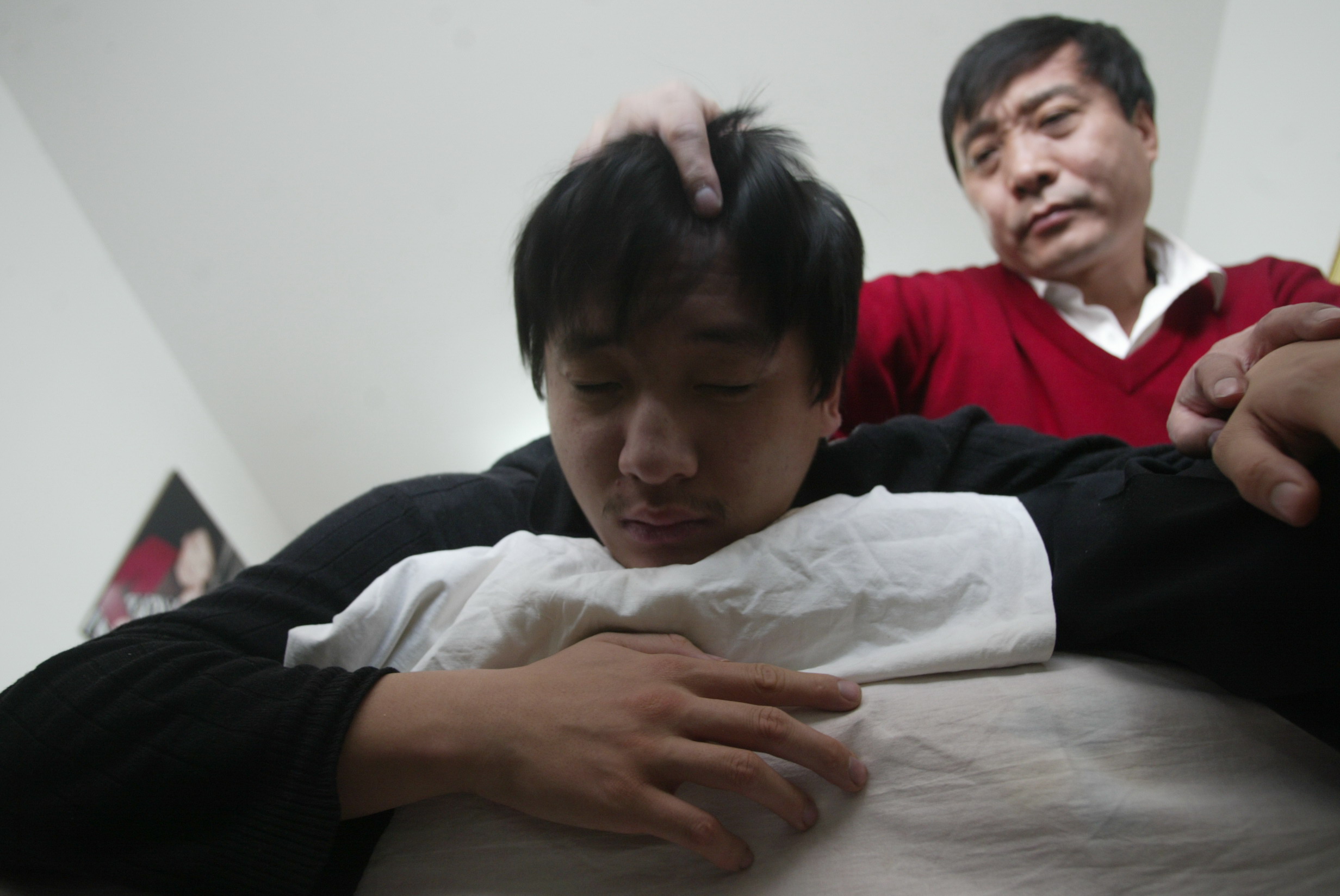 ↑ 汪强的父母为他按摩。