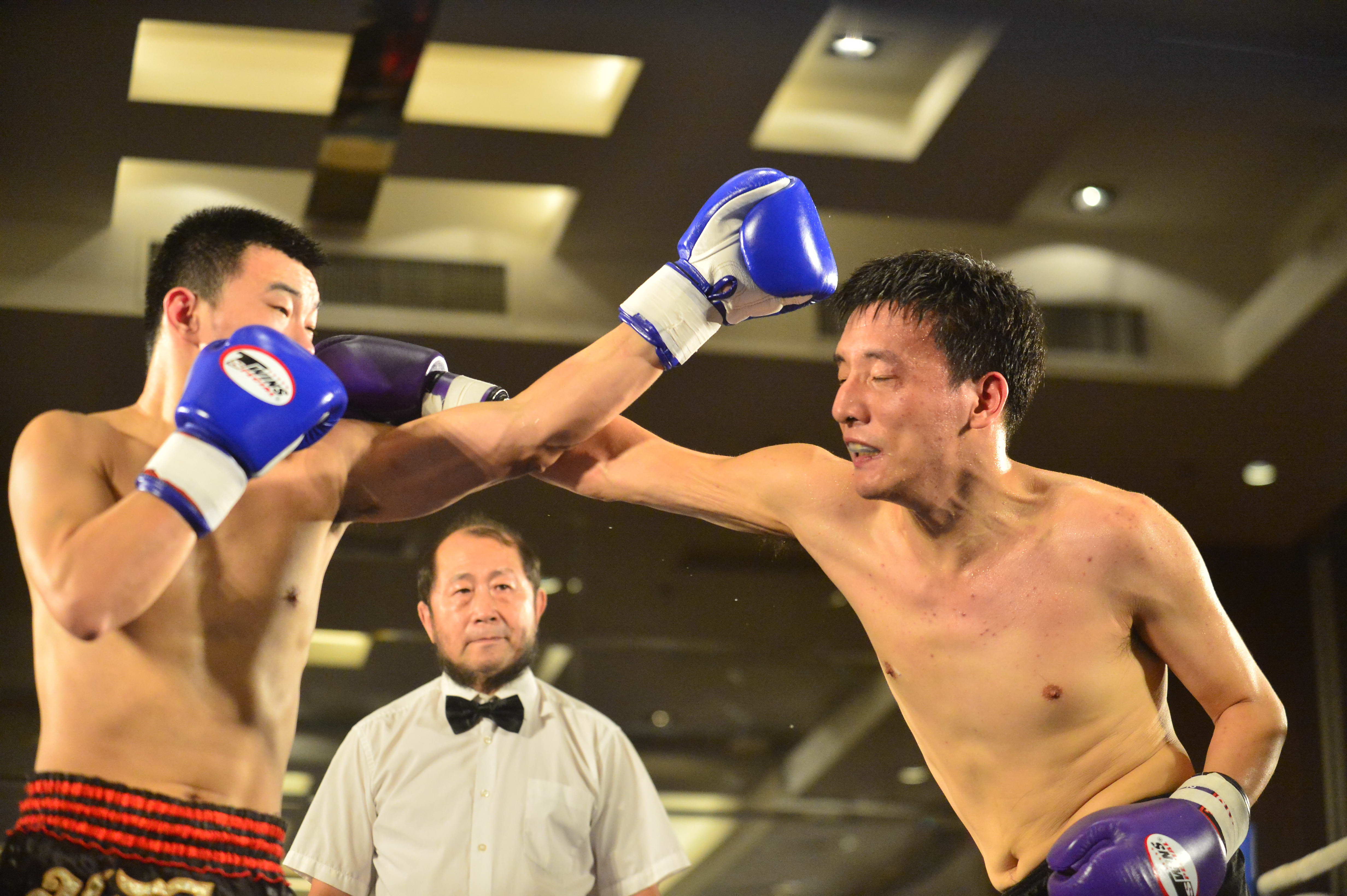↑ 2014年9月13日,汪强(右)参加上海第四届中外拳击对抗赛。