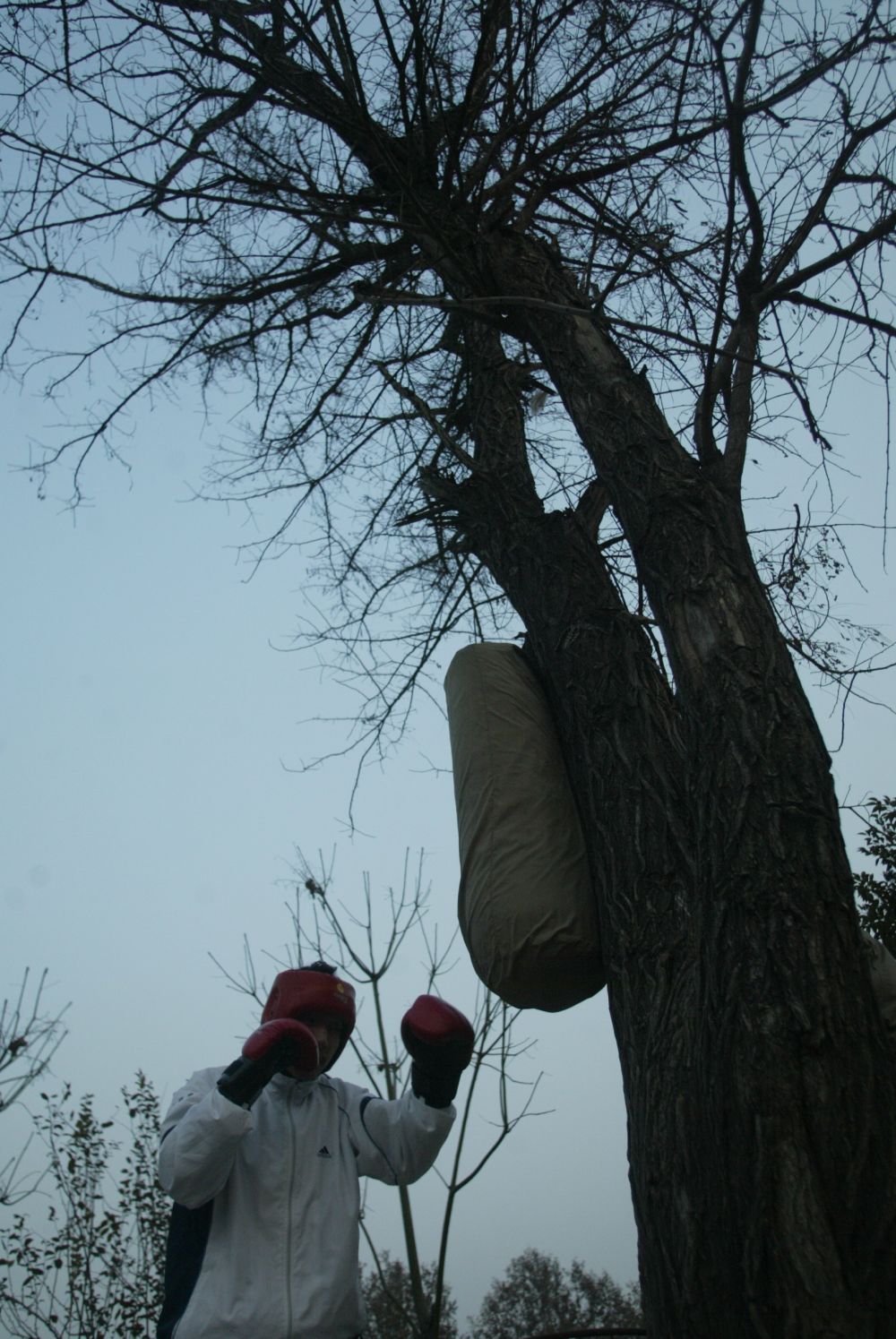 他们的训练场就是汪强家附近的小河边,每天他和父亲要骑自行车近两公里,而练拳的沙袋只能挂在河边的大树上。