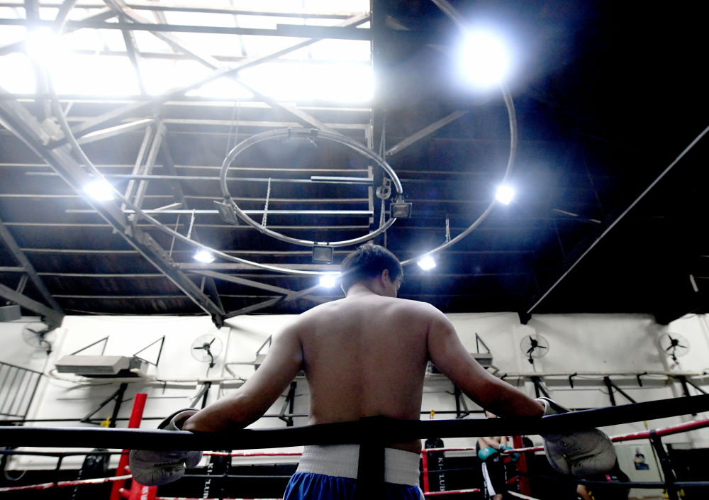 ↑ 2019年8月8日, 汪强 (左)在一家拳击俱乐部指导学员石彬彤练习打拳。