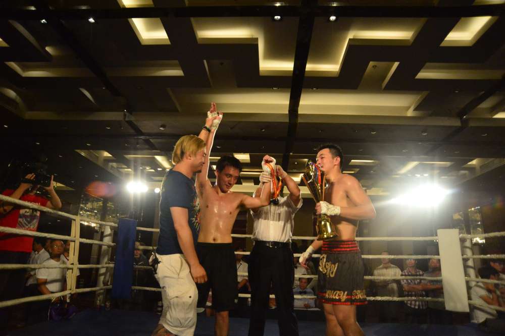 ↑2014年9月13日,汪强参加第四届上海中外俱乐部拳击对抗赛。虽然输掉了比赛,但是他赢得了全场的掌声。